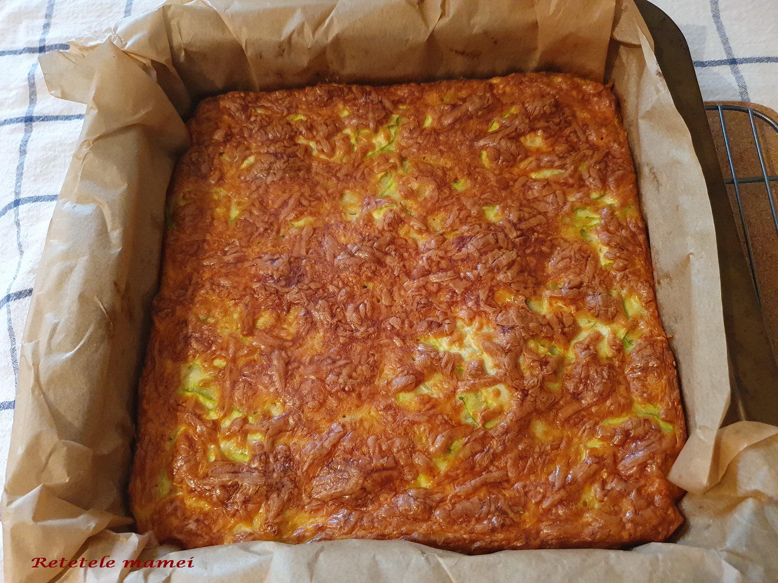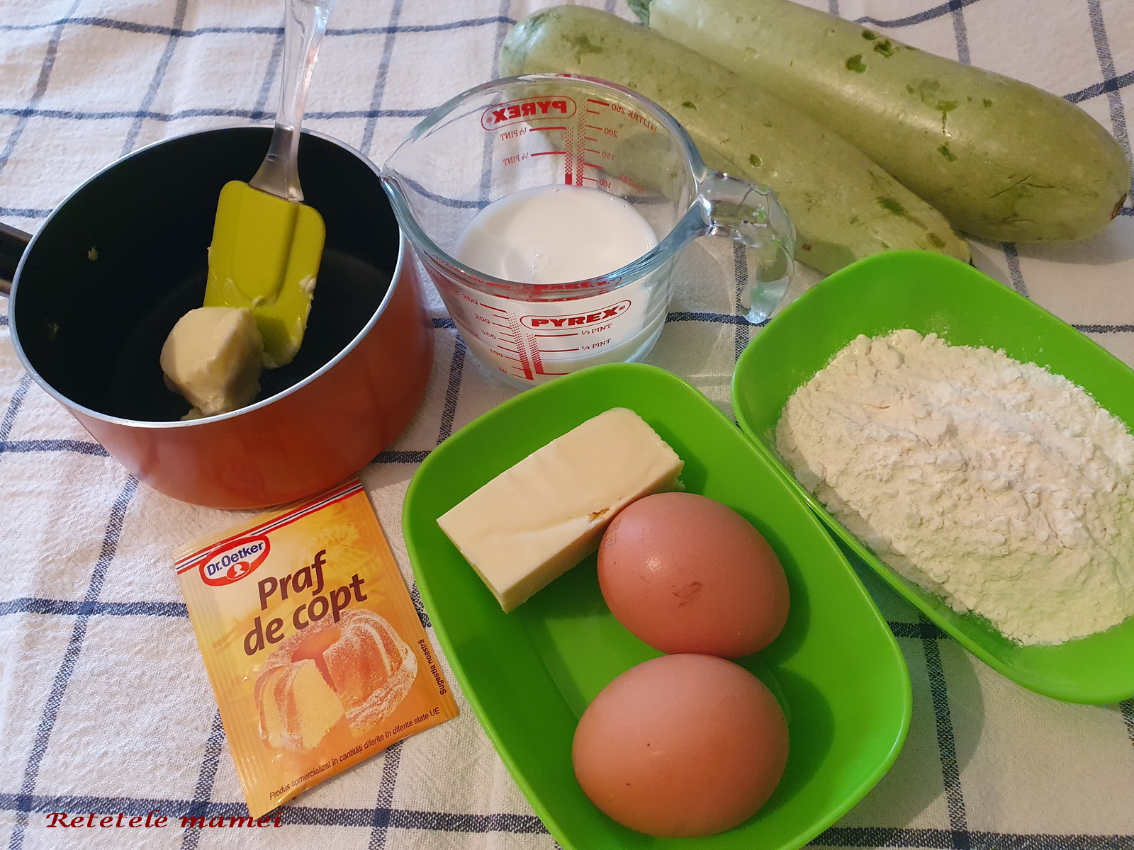 Ingrediente: 700 g dovlecei, 2 ouă, 70 g făină un plic praf de copt, 100 ml lapte, 20 g unt topit, sare, 40-50 g cașcaval