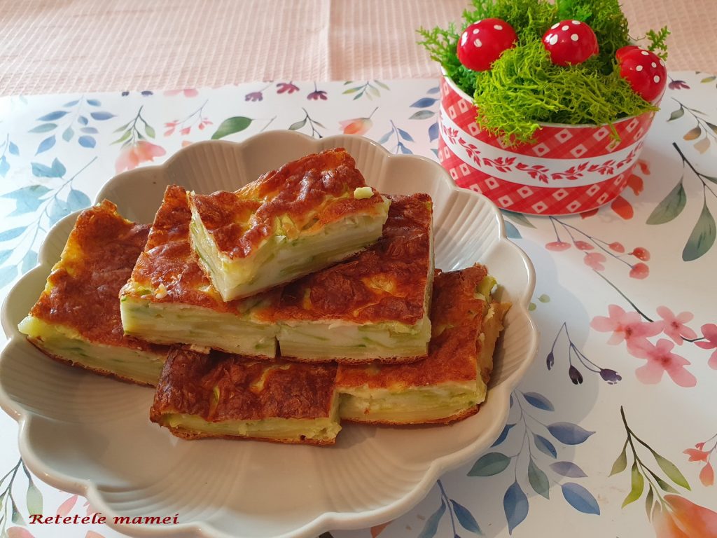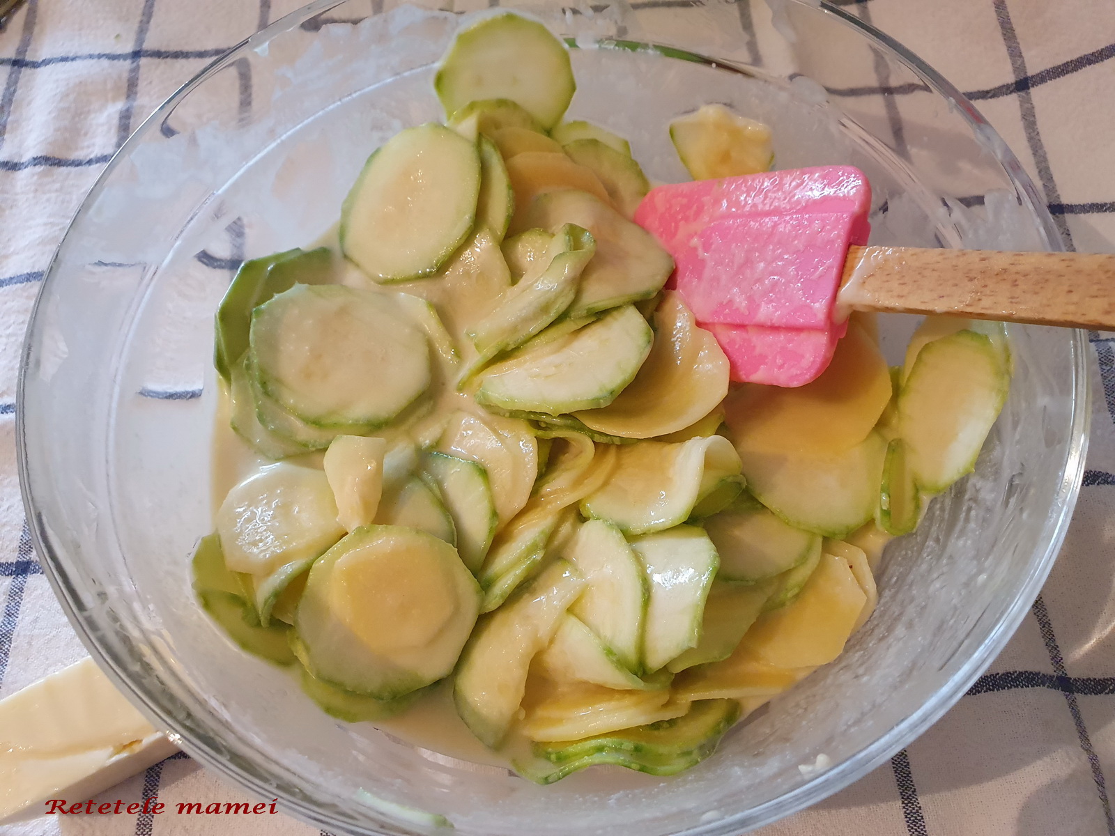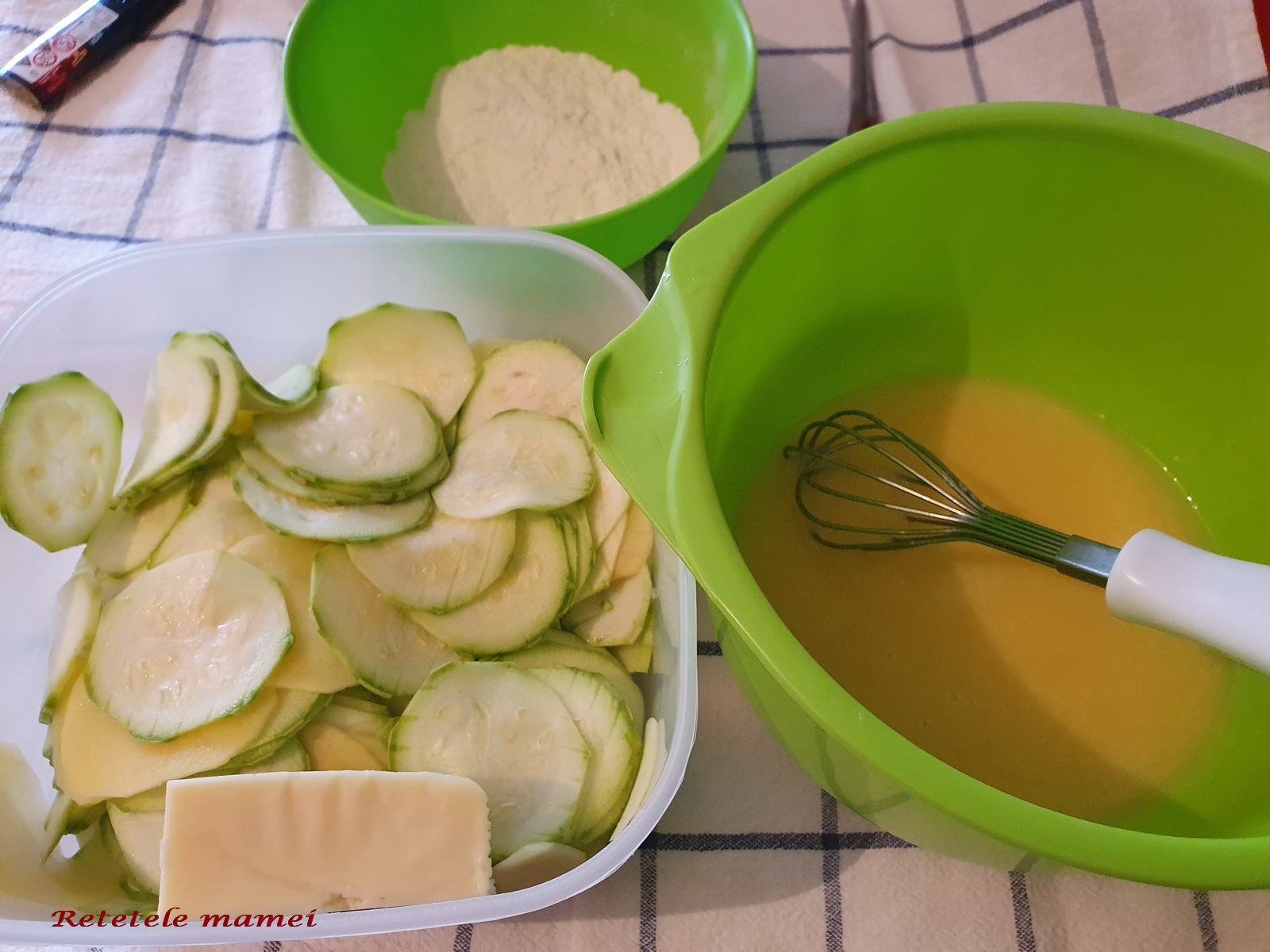 Mod de preparare: Se curăță de coajă dovleceii rămânănd câte o fâșie de cojă pentru aspect și se feliază cu mandolina. Eu am pus și un cartof mare curățat și feliat pentru că nu am avut gramajul necesar de dovlecel. Într-un castron încăpător se bat ouăle cu puțină sare, untul topit și răcit și laptele. Peste compoziția lichidă se adaugă făina și praful de copt cernute. Se amestecă după care se pun dovleceii rași și se încorporează cu spatula.