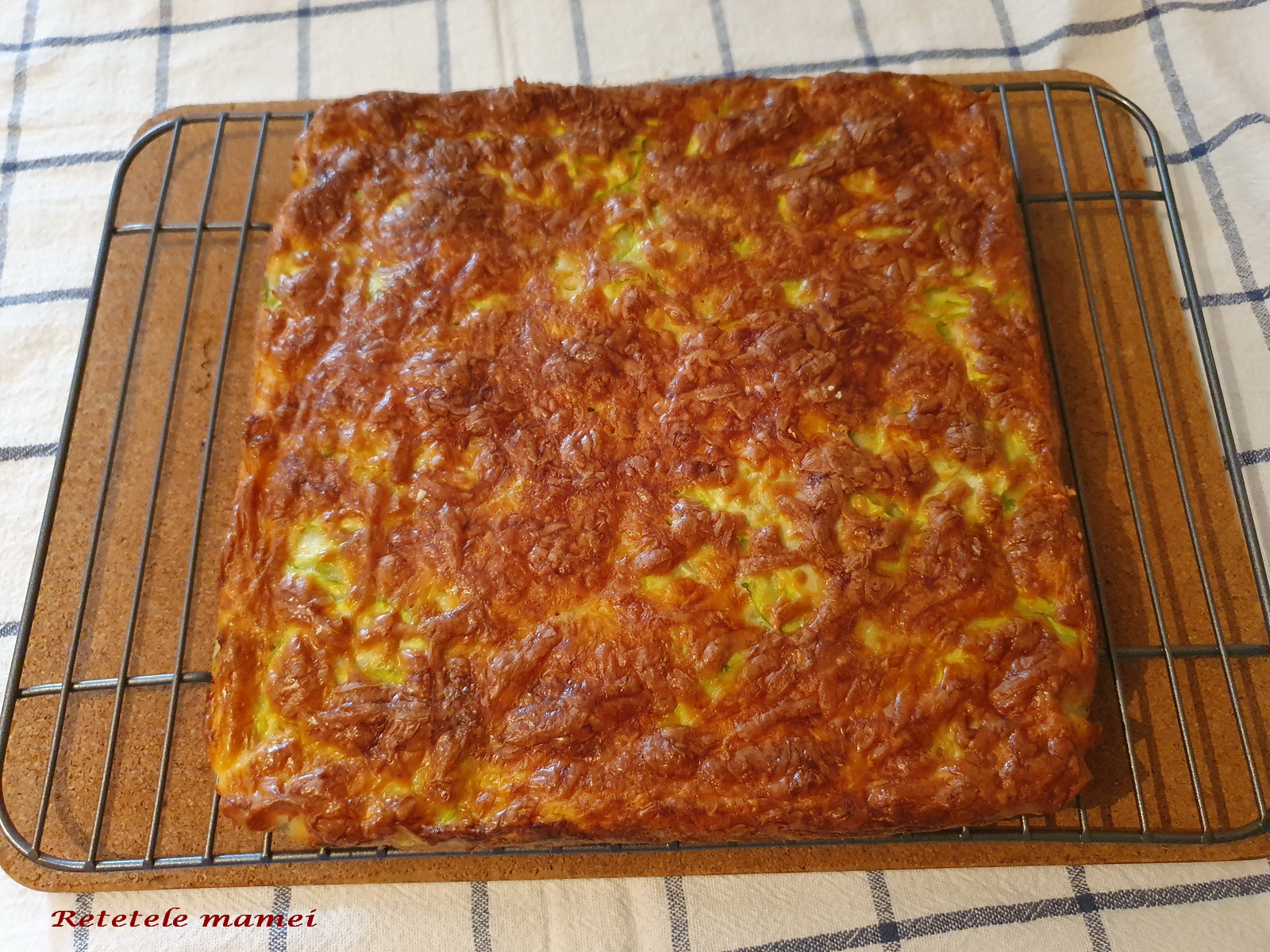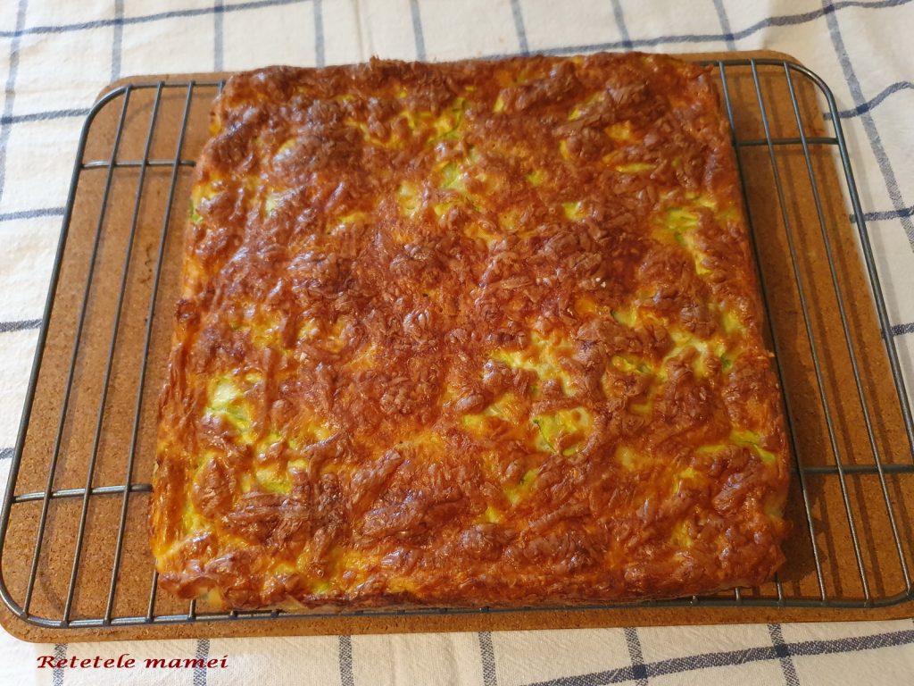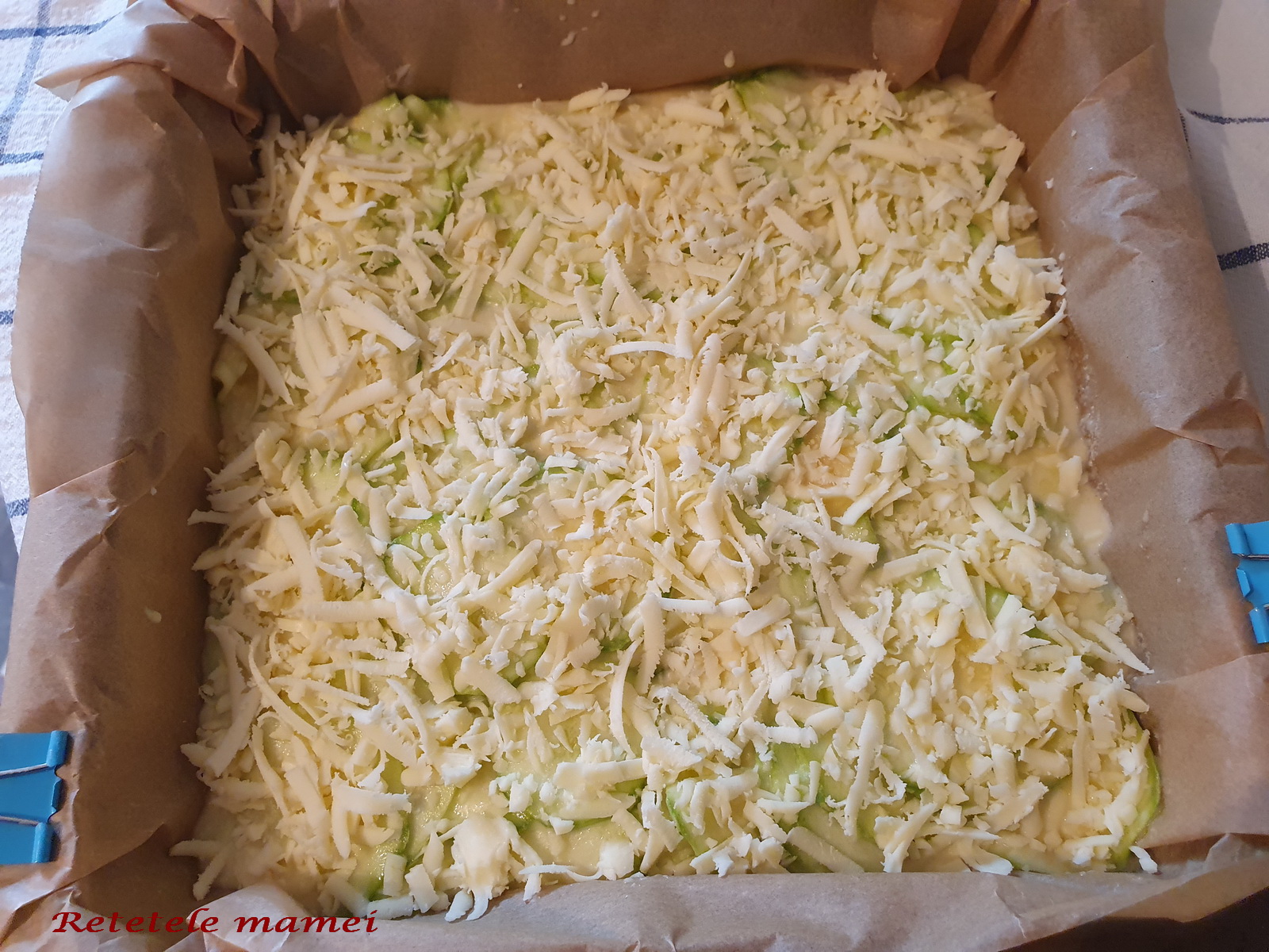 Compoziția se toarna în tava tapetată cu hârtie de copt. Tava folosită de mine este de 25/25. Deasupra de presară cașcaval ras.