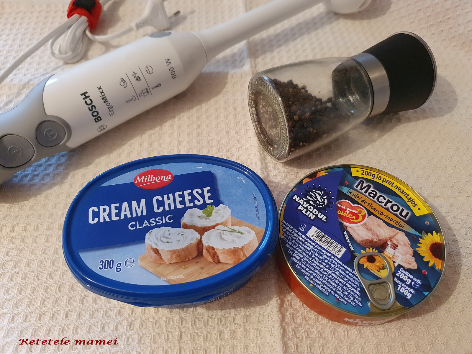 Ingrediente: 1 cutie macrou, cremă de brânză clasică Milbona (merge orice cremă de brânză, eu asta aveam în frigider), sare, lămâie și un blender.