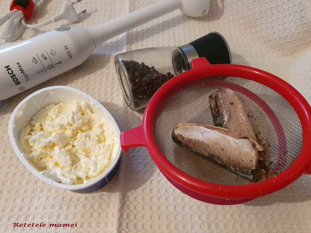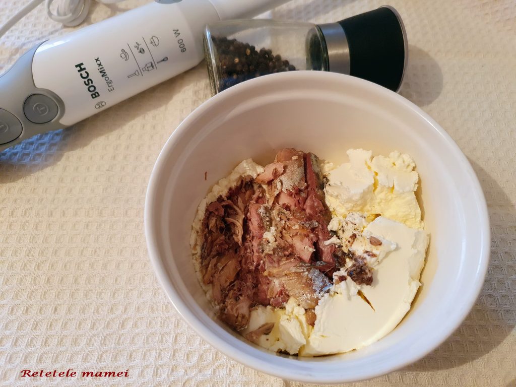 Mod de reparare: Se scurge bine peștele din conservă, se pune într-un vas mai adânc, se adaugă crema de brănză și se blenduiește cu mixerul vertical.