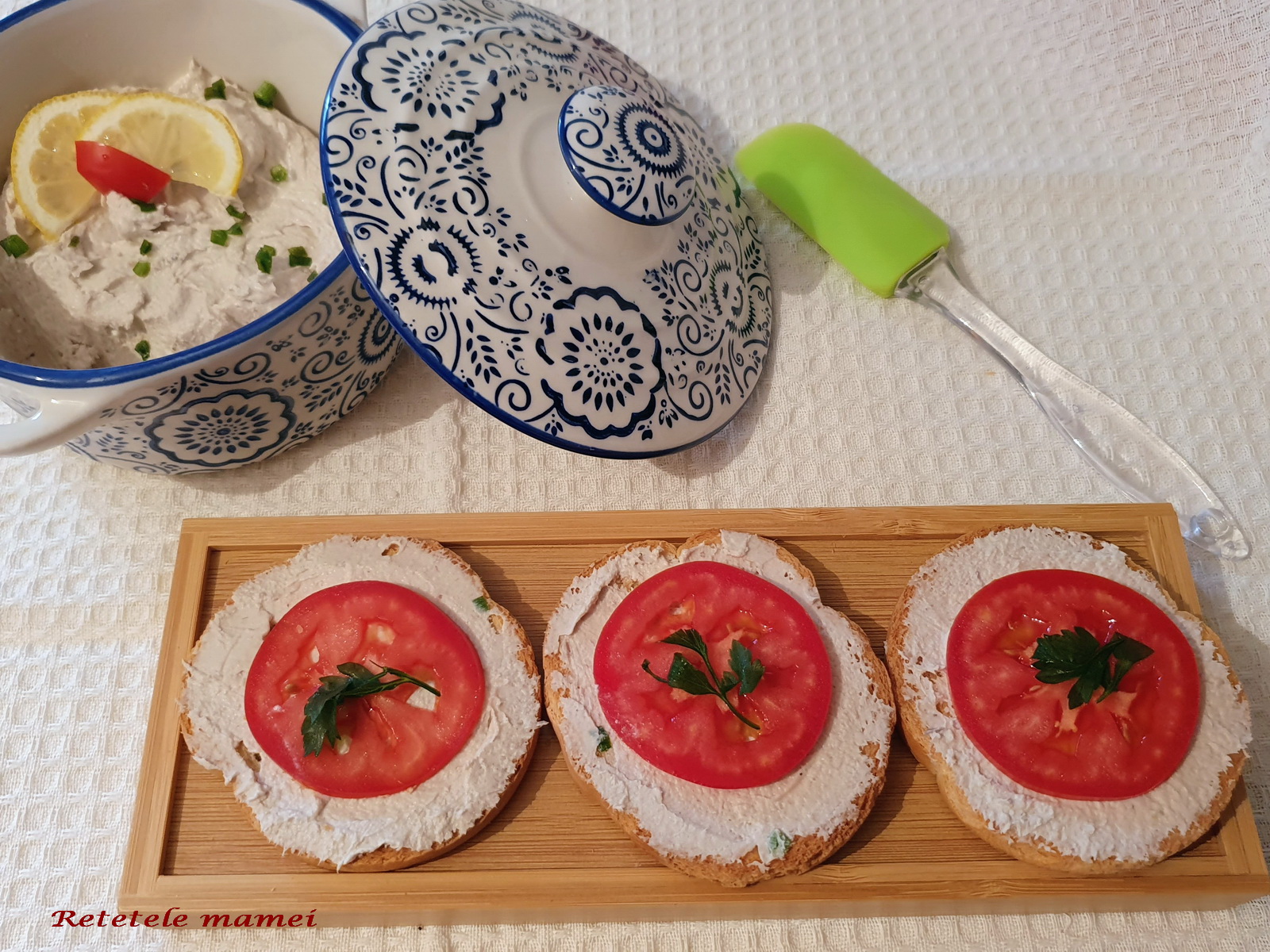 Se poate servi pe felii de păine prăjită sau pâine simplă. Eu am folosit câteva rondele prăjite de la Lidl, ornate cu felie de roșie.