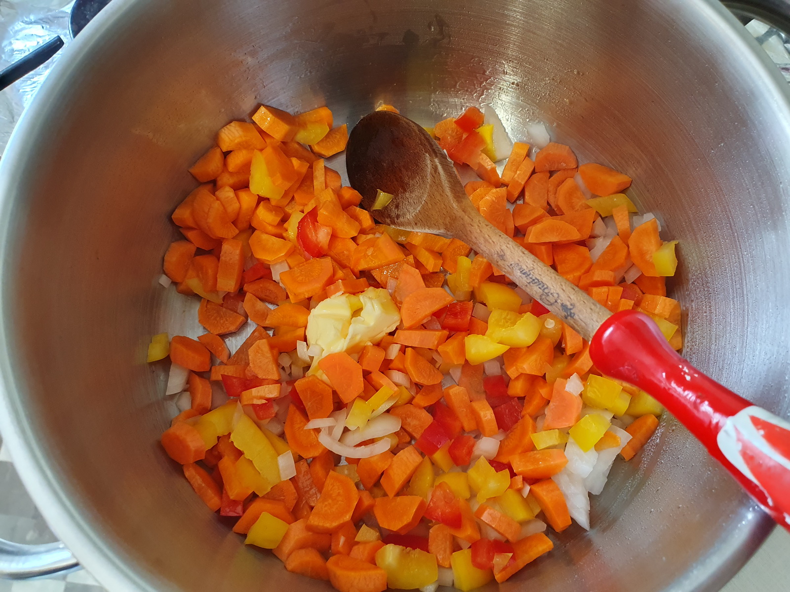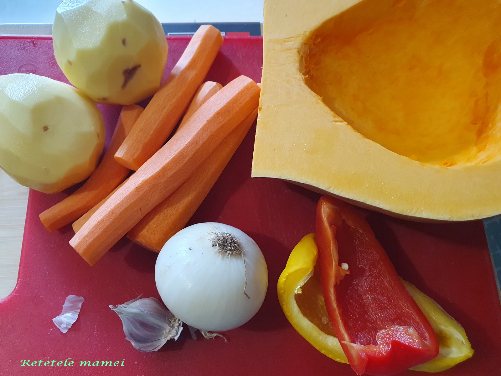 Ingrediente: 1 kg de dovleac, 3-4 morcovi (depinde de mărime), 2-3 cartofi, 1 ceapă, 1/2 ardei gras, 3-4 căței de usturoi, ulei/unt, smântână pentru gătit, sare.