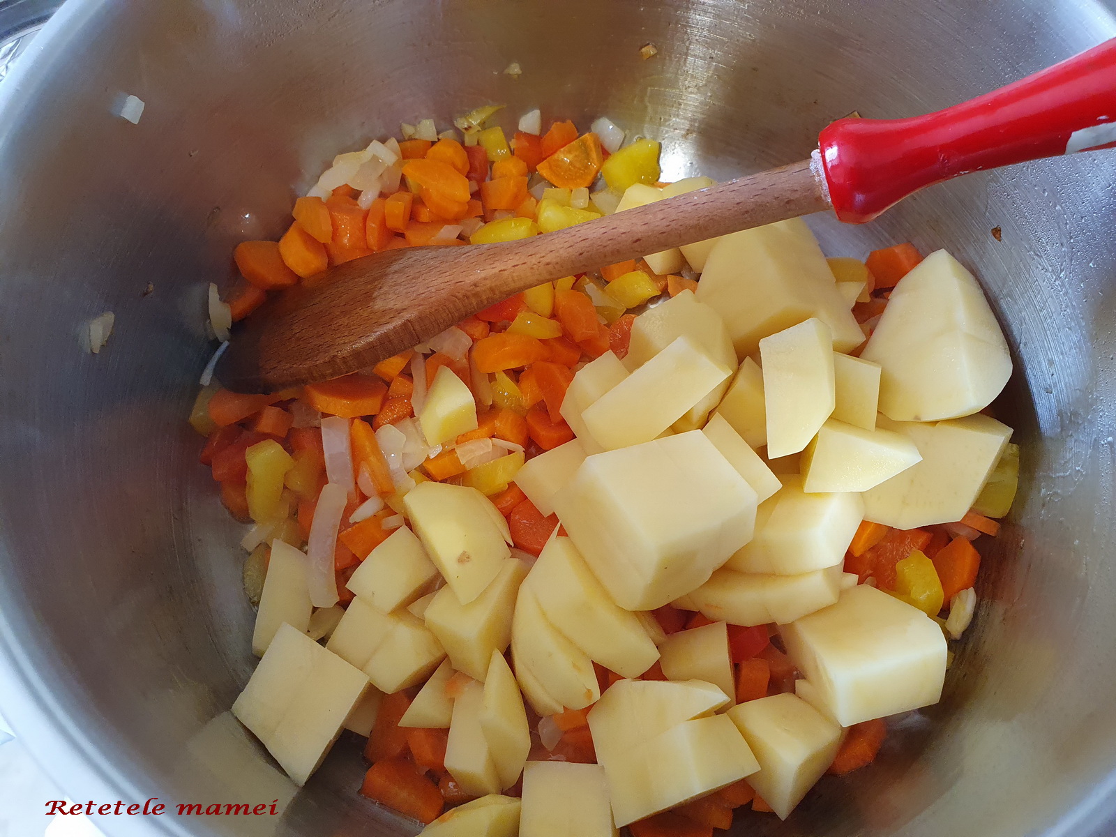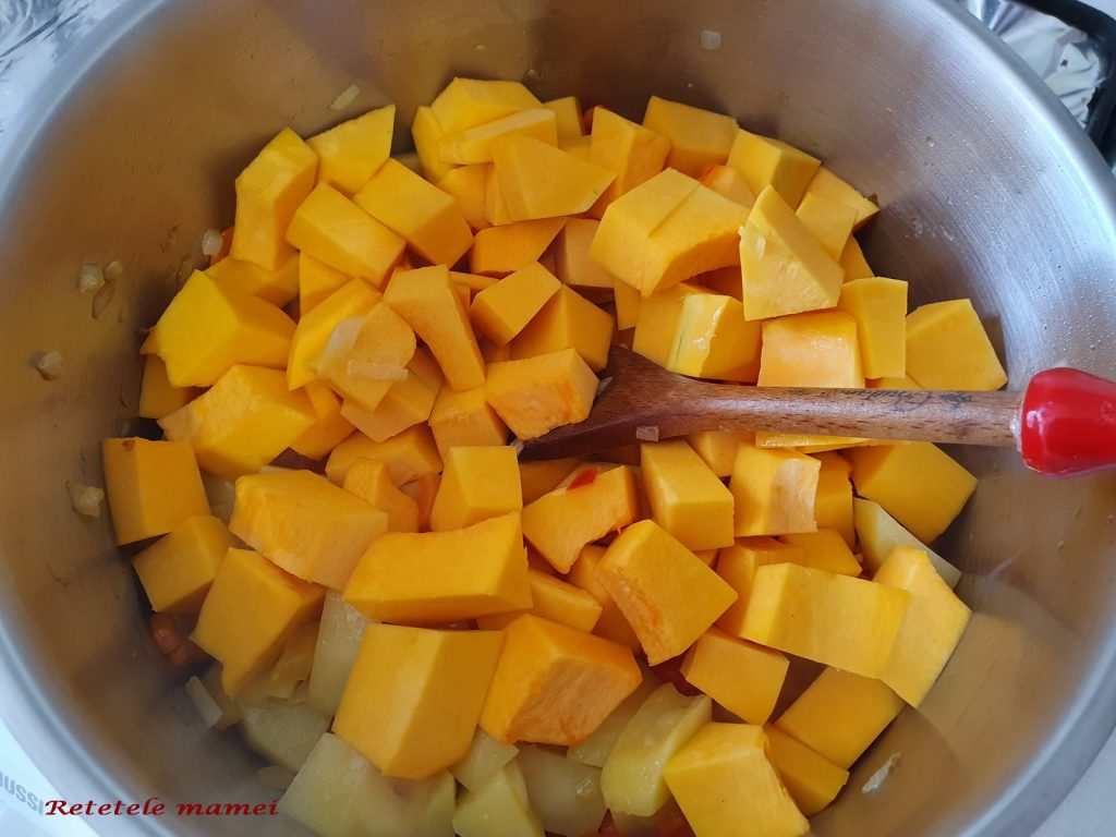 Mod de preparare: Se călesc legumele tăiate cubulețe în ordinea aceasta: ceapa, ardeiul, morcovul și usturoiul în puțin ulei și un cub mic de unt. Se adaugă cartofii și se mai călesc câteva minute împreună. Se pune un strop de sare. Se adaugă dovleacul tăiat cuburi și bineînțeles curățat de coajă. Se toarnă apă caldă cât să acopere legumele.