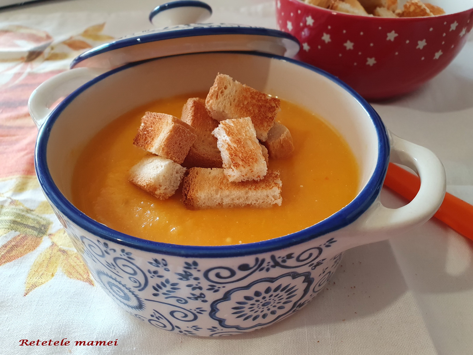 O supă cremă aromată, gustoasă care se servește cu crutoane și cine doreste poate adăuga pentru mai multă savoare câteva bucățele de bacon prăjit.