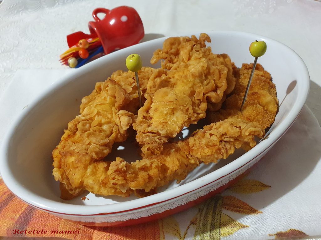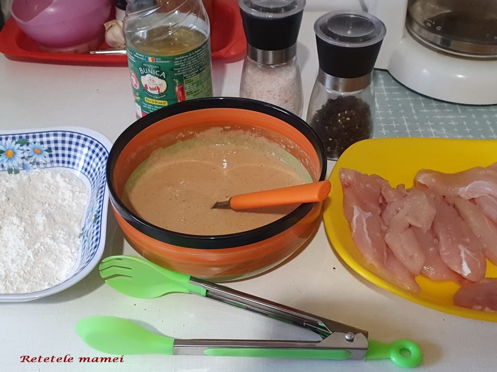 Mod de preparare: Se taie pieptul de pui fâșii. Într-un bol încăpător se amesteca făina cu condimentele, ouăle și puțină apă obținându-se un sos mai gros. În alt bol se pune doar făină. Se trec fâșii de pui prin amestecul cu ou și pe urmă prin făină. Se prăjesc în baie de ulei.