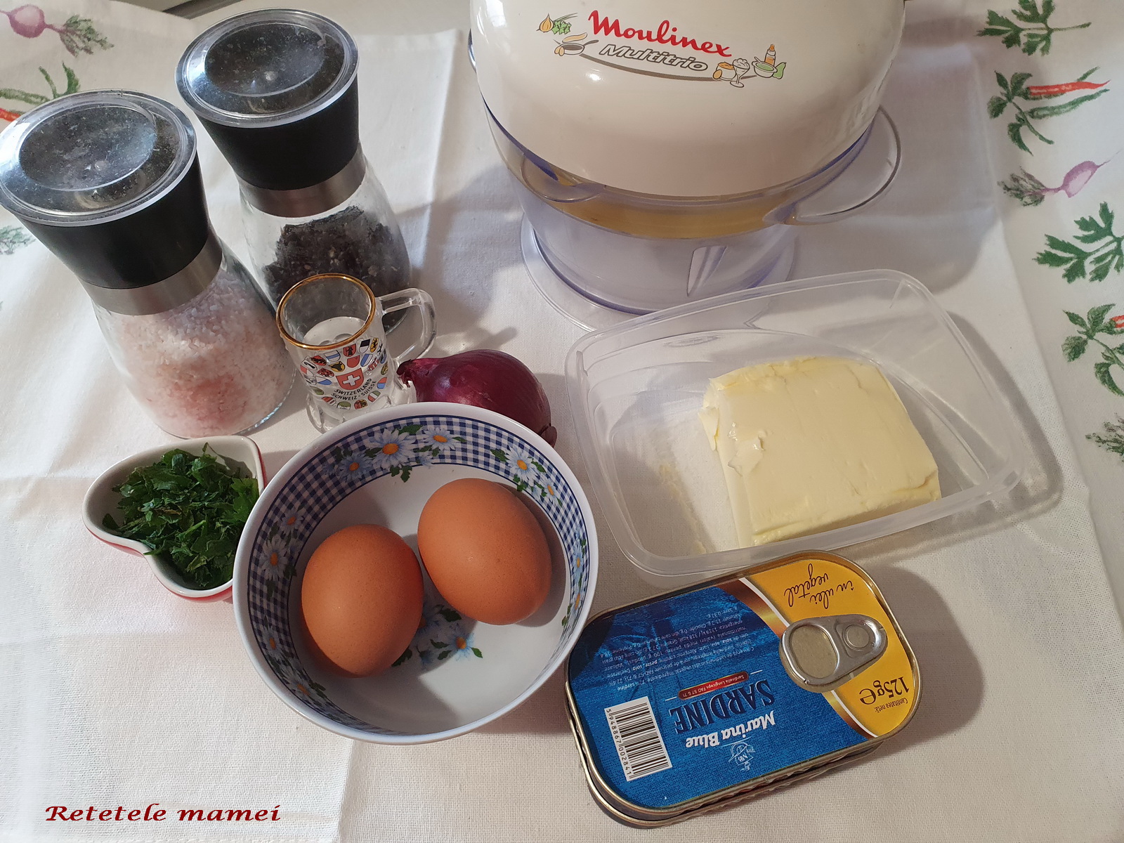 Ingrediente: 2 cutii sardine în ulei, 2 ouă fierte tari, 1/2 ceapă, pătrunjel
