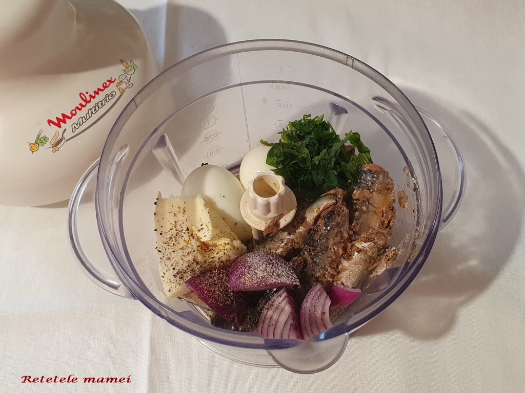 Mod de preparare: se pun toate ingredientele (sardinele scurse de ulei) în tocător sau mixer vertical și se mixează pănă compoziția devine o pastă.
