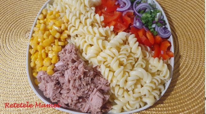 Uneori avem nevoie și de câte un preparat ușor dar gustos și cu ingrediente la îndemână. Astăzi o salată rece de paste cu ton. Eu am făcut doar o porție, puteți multiplica ingredientele sau puteți folosi alte combinații.