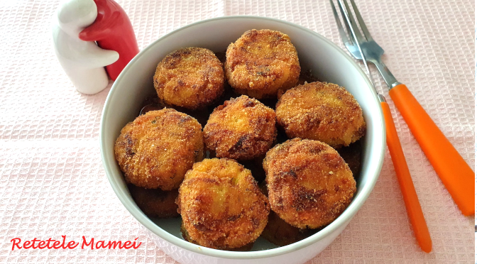 Ingrediente: 300 g dovlecei, 2 cartofi mari, 100 g cascaval, 1 ou, 2 catei de usturoi, sare, piper, boia, pesmet
