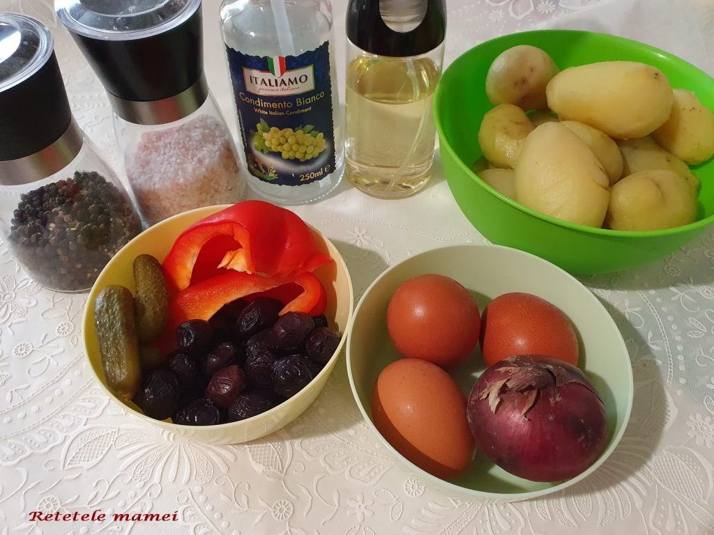 Ingrediente: 4-5 cartofi, 3 oua, 3 ridichi, 3 fire ceapa verde, ulei, otet balsamic, ulei de soia, sare si piper.