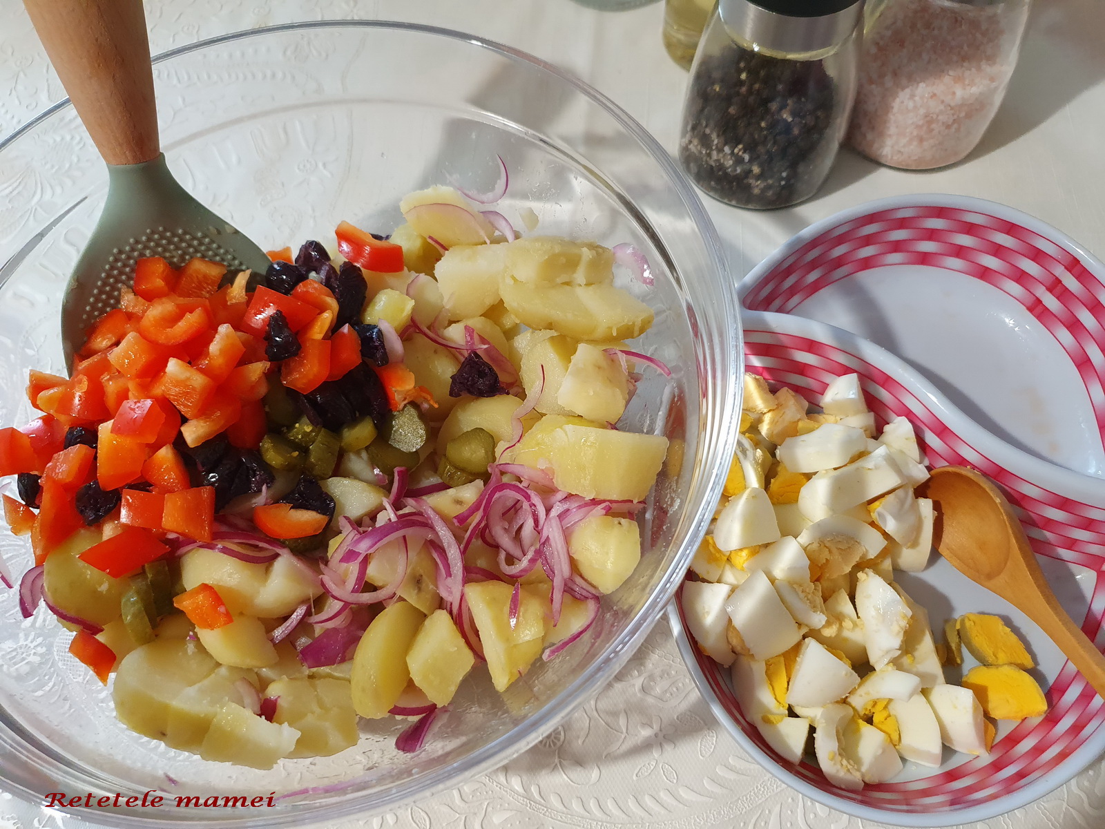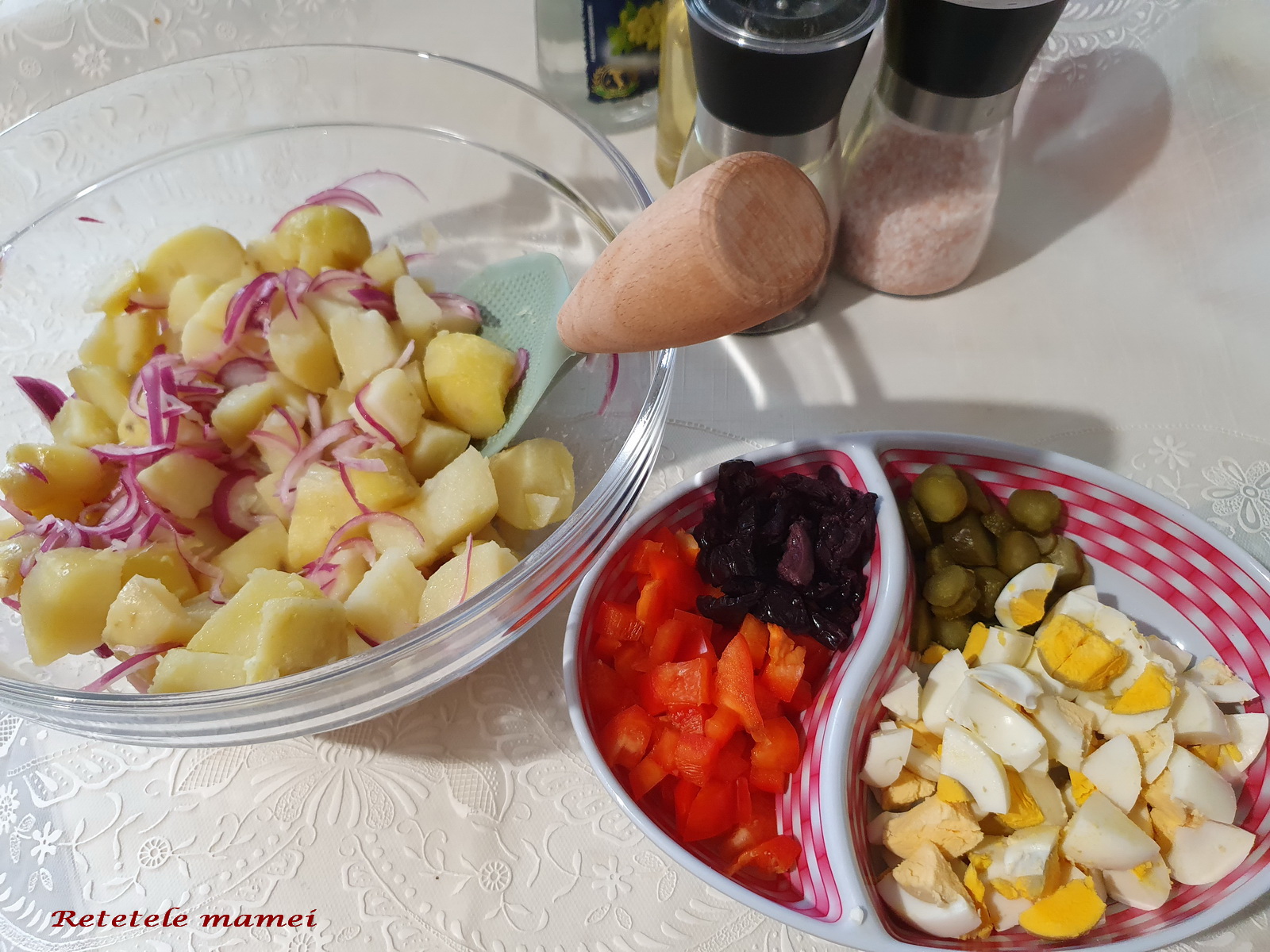 Ingrediente: 2 cartofi mari fierti, o ceapa mica, o ou fiert, ardei kapia, maioneza, lamaie, sare si piper.